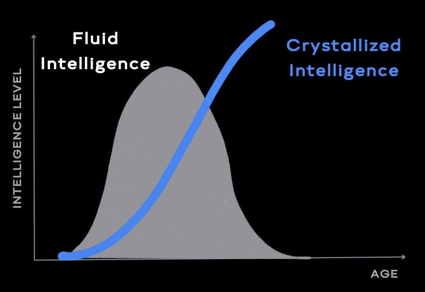 - Crystallized Intelligence represents the intelligence of experience. It begins to rise as Fluid Intelligence declines, with the compounding accumulation of knowledge accelerating during later career years.
